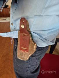 vendo fondina in pelle scamosciata, marrone, marcata Holster 97-10, per pistola beretta 84 o similari. per uso sportivo, tiro a segno. in ottime condizioni usata poche volte. misure approssimative in centimetri: altezza complessiva 20, larghezza 9. il prodotto non è pericoloso. euro 15