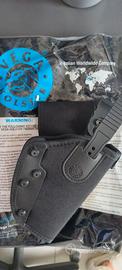 Estrazione Rapida, posizione di porto leggermente inclinata sul fianco destro, adatta per un uso professionale in divisa o tattico in nylon/cordura imbottito e rinforzato con PE e polimero.