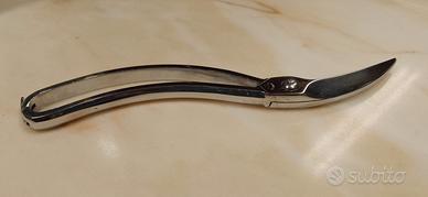 Forbici francesi trinciapollo in acciaio cromato fatte a mano. Nonostante l'aspetto affusolato le forbici hanno un peso di 260 g trattasi di un oggetto professionale di alta qualità e durevolezza. La cromatura è ancora perfetta e lucida, solo lievissini segnetti che l'ingrandimento fotografico accentua.