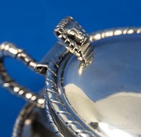 Raffinata formaggera in stile San Marco Veneziano, completa di coperchio a cerniera basculante e manico con lvetta a forma di testa leonina.