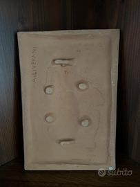 Formella in terracotta color nocciola chiaro con bassorilievo della Madonna Delle Grazie realizzata negli anni ‘70 dal ceramista “Antonio Liverani” (firma sul retro) per la “Parrocchia Duomo di Faenza”.
