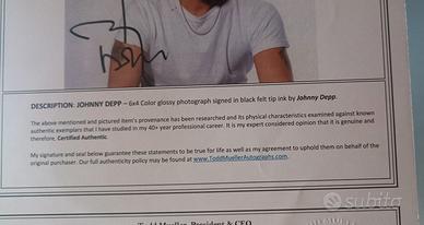 Splendida fotografia lucida a colori misura 15 X 10 cm firmata con inchiostro nero a punta di feltro da Johnny Deep,su carta fotografica Kodak xtralife paper,il tutto corredato da certificato di autenticità Tood Mueller numero: ITEM -HH6254 del 13/04/2025 in ottime condizioni il pezzo proviene dalla mia collezione privata. Il formato della data del certificato è in formato Americano mese/giorno/anno.