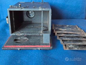 Un piccolo gioiello per collezionisti e appassionati di fotocamere d’epoca. Era la fotocamera di mio nonno, utilizzata nei primi anni del 900. Completa di 6 portalastre 6×8 cm.