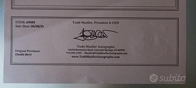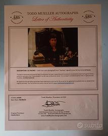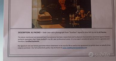 Splendida fotografia satinata a colori misura 25,5 X 20 cm scena tratta dal film "Scarface" firmata con inchiostro blu a punta di feltro da AL PACINO su carta fotografica Fujifilm Fujicolor crystal archive paper , il tutto corredato da certificato di autenticità Tood Mueller numero: ITEM -JJ4309 del 08/06/2025, il pezzo proviene dalla mia collezione privata.La data riportata sul certificato è in formato americano mese/giorno/anno.