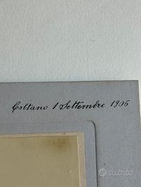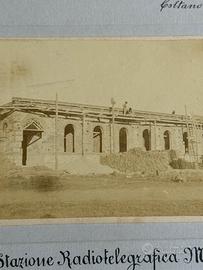 Piccola foto seppiata, mm. 85x29, montate su cartoncino rigido di mm. 110x140. La stazione durante la costruzione in Coltano, animata con didascalie a stampa e penna. Stazione Radiotelegrafica Marconi. Coltrano 1 Settembre 1906.