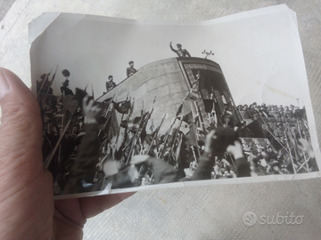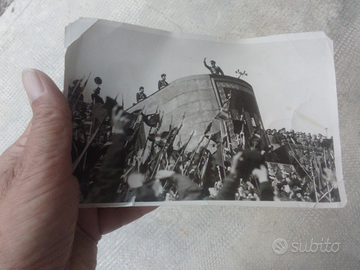 Fotografia di Vittorio Emanuele III che parla dal foro Mussolini ad una adunata folla di squadristi. Fotografia degli anni '30,spigolo in alto destro mancante, spigolo in alto sinistro mancante, grande piega a sinistra in alto, tutto ben visibile da fotografie. Le misure:17,8 centimetri x 11,7 centimetri