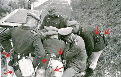 Interessante e rara fotografia d’epoca nazista che ritrae alcuni soldati del HEER-WEHRMACHT intenti a studiare “piani militari” d’offensiva di guerra. In particolare, si possono notare, su alcuni soldati, l’equipaggiamento bellico in dotazione “a corredo”, come le borracce per l’acqua, le baionette in versione “kombat” ed i porta-caricatori per il fucile Mauser K98. Al verso reca tracce di residui di album sul quale era stata probabilmente posizionata tramite colla. Il bel cimelio cartaceo si presenta in "ECCELLENTI " condizioni di conservazione, senza mancanza, rottura e/o difetto alcuno. Misure: 97 x 65 mm.