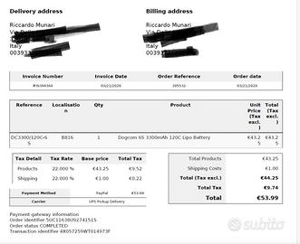 Vendo batteria LIPO 3300 Dogcom come nuova solo 2 cicli di ricarica. Vendo perché non adatta al mio drone 5 pollici. Specifiche: • Marca:DOGCOM • Capacità:3300mAh • Tensione e configurazione:22.2V / 6S1P / 6 Celle • Tasso di scarica continuo:120C • Tasso massimo di scarica a impulso:240C • Potenza in uscita:Erogazione di energia 6S ad alte prestazioni • Dimensioni:138mm (L) x 43mm (W) x 44mm (H) • Peso:~530g • Spina di bilanciamento:JST-XHR • Tipo di connettore:XT60