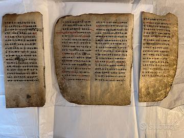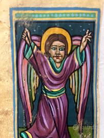 Tre meravigliosi frammenti di Bibbia etiope in lingua liturgica Ge’ez, raffigurante la crocifissione di Cristo. Se pur d’epoca, conserva colori e scritte magnificamente. Proviene da un eredita’ e non conosciamo la data e il periodo storico di appartenenza dell’oggetto. In una delle immagini, presa dal web, c’e’ la descrizione di cosa si tratta.