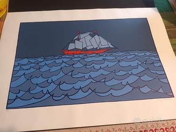Un’opera grafica dal forte impatto visivo e poetico, firmata dal celebre artista Francesco Casorati. In questa serigrafia, Casorati ci trasporta in un viaggio onirico attraverso un mare stilizzato, dove un veliero geometrico, dalle vele cubiste e dalla barca rosso fuoco, solca acque azzurre inquiete sotto un cielo profondo.