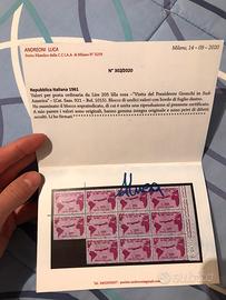 Gronchi Rosa autentico e certificato Bolaffi, in ottime condizioni come da foto. Oltre al certificato originale Bolaffi, possiede anche copia del certificato del blocco da cui è stato prelevato il francobollo.