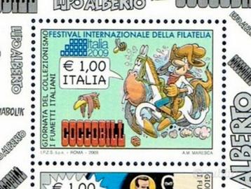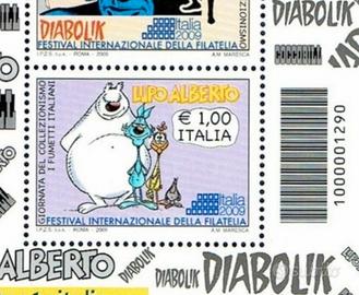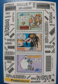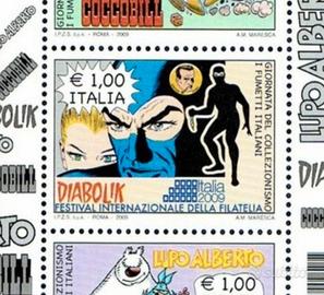 foglietto con 3 francobolli: Coccobill, Diabolik,lupo Alberto . anno 2009, festival internazionale della filatelia . condizioni perfette.