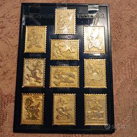 Francobolli Operazione Quack Topolino 1973 metallo dorato, collezione completa 10 pezzi con personaggi e raccoglitore in velluto. Come nuovo.