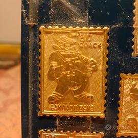 Francobolli Operazione Quack Topolino 1973 metallo dorato, collezione completa 10 pezzi con personaggi e raccoglitore in velluto. Come nuovo.