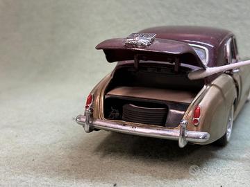 Modello: Bentley R-Type Continental Fastback (1955) Carrozzeria: H.J. Mulliner (fastback) Produttore modellino: Franklin Mint Scala: 1:24 Linea: Franklin Mint Precision Models Materiale: die-cast metal + parti in plastica Periodo produzione modellino: fine anni ’90 / primi 2000 👉 È uno dei classici Franklin Mint di fascia alta, molto dettagliato e pensato per collezionisti adulti (non giocattolo). 🧩 Caratteristiche visibili ✔️ Cofano apribile con motore dettagliato ✔️ 4 porte apribili ✔️ Bagagliaio apribile ✔️ Interni curati (sedili, plancia, volante) ✔️ Telaio dettagliato (scarico, sospensioni) ✔️ Verniciatura bicolore originale ✔️ Targhe “1955” ✔️ Scatola originale in polistirolo Franklin Mint ✔️ Busta/documentazione Franklin Mint presente
