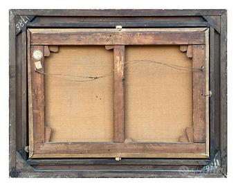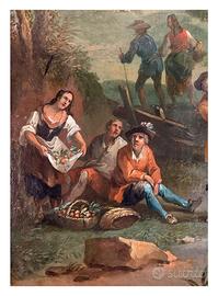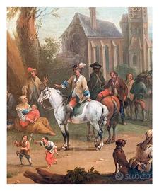 Franz de Paula Ferg (att.) Vienna, 1689 – Londra, 1740 Scena di villaggio Olio su tela, cm. 46×64 entro cornice in legno dorato e scolpito L’opera in questione è un olio su tela di dimensioni 46×64 cm. Raffigura una vivace scena di paese in cui diverse figure animano la composizione. In primo piano, gruppi di persone sono impegnati in attività quotidiane: una madre con il bambino, un mercante che parla con una donna, e personaggi seduti in conversazione o intenti a riposarsi. Al centro della scena, un uomo a cavallo attira l’attenzione, mentre sullo sfondo spicca una chiesa, simbolo della centralità della comunità religiosa nella vita rurale. La composizione è arricchita da dettagli pittoreschi, come i cani, i bambini che giocano, e i cavalieri che si muovono lungo la strada. Gli alberi incorniciano la scena, mentre la chiesa e le abitazioni sullo sfondo creano un senso di profondità. La tavolozza cromatica è dominata da tonalità calde e terrose, che conferiscono un senso di armonia e serenità alla scena. Il dipinto in oggetto può essere confrontato con altre opere di Franz de Paula Ferg conservate in musei e collezioni private. Ad esempio, “Scena di mercato” e “Paesaggio con contadini”, entrambe conservate al Museo di Belle Arti di Lipsia, mostrano similitudini stilistiche e tematiche. Anche in queste opere, Ferg dimostra una spiccata attenzione per i dettagli e una predilezione per scene affollate e animate. Tutti elementi che confermano la bontà dell’attribuzione al pittore austriaco. In particolare, l’uso della luce per enfatizzare i volti e le attività principali è un tratto distintivo del suo stile, che ritroviamo anche nel dipinto qui analizzato. Questa coerenza stilistica rende le sue opere immediatamente riconoscibili e apprezzate dagli appassionati d’arte.