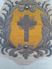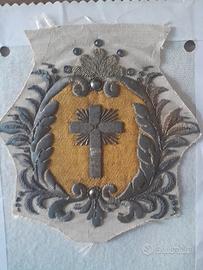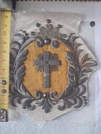 Antico Stemma distintivo o fregio in tessuto ricamato di origine storica o ecclesiastica.presenta una lavorazione con fili metallici grigio argento in argento su uno sfondo di tessuto dorato al centro una croce circondata da un motivo a raggiera che suggerisce un simbolo religioso o militare . pezzo d'epoca forse parte di una divisa un paramento liturgico o uno stendardo.epoca metà 800