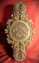 Descrizione: Il fregio presenta una ricca cornice sagomata e simmetrica, caratterizzata da motivi fitomorfi e volute di gusto tardo barocco-rococò, tipiche della produzione lignea ecclesiastica di fine Settecento. Al centro campeggia un medaglione circolare contenente l’Occhio della Provvidenza, inscritto in un triangolo e circondato da raggi luminosi e nubi scolpite a rilievo. L’occhio, reso con sobrietà ma precisione formale, costituisce il fulcro visivo e simbolico della composizione. La cornice esterna, movimentata da profili mistilinei e fogliami stilizzati, amplifica l’effetto di solennità e sacralità, dialogando con l’architettura della volta per cui l’opera fu concepita.