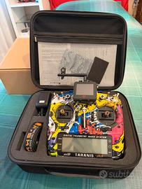 Radiocomando FrSky Taranis X9D plus SE come nuova completa di tutto con custodia protettiva, caricabatterie, laccio, proteggi gimbal ed in aggiunta anche schermo per video fpv e stand posteriore in alluminio.