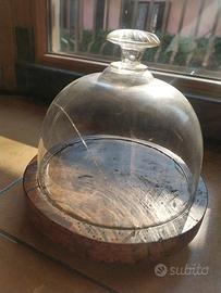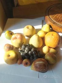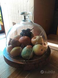 I frutti sarebbero vendibili anche singolarmente senza supporti o contenitori, ma lascio il piatto base in legno originale con campana in vetro (con crepa). Vendo a euro 70 il tutto.