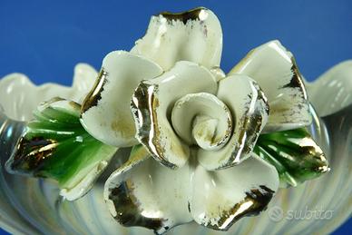 Elegante portafrutta in ceramica di Bassano dipinta a smalto nei colori del grigio e del verde, con fiore centrale a tutto tondo e dorato.