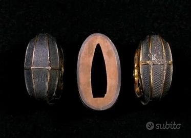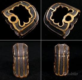 Bellissimo set Handachi Wakizashi/Katana periodo Edo Materiale: Rame rosso Dimensioni (Accessori Fuchi) Circa 3,82 cm x 2,17 cm x 1,08 cm (Spessore) (Accessorio 1) Circa 3,42 cm x 1,61 cm x 3,00 cm (Spessore) (Accessorio 2) Circa 3,29 cm x 1,55 cm x 3,00 cm (Spessore)