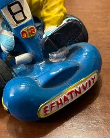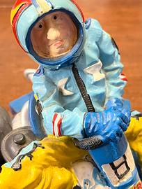 Caratteristiche della statua: pilota di go-kart con casco e tuta celeste mentre impugna il volante di un go-kart blue con ruote dettagliate e motore a vista.