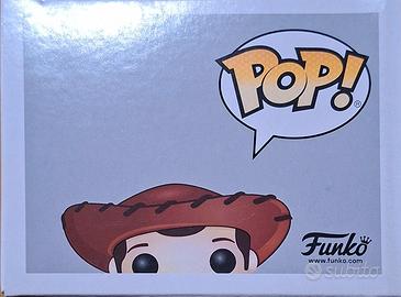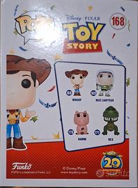 Funko Pop! di Woody, protagonista di Toy Story, identificato dal numero 168. Questa specifica versione è stata rilasciata per celebrare il 20° anniversario dello storico film Disney Pixar del 1995, come indicato dal bollino speciale blu e giallo visibile nell'angolo in basso a destra della confezione.