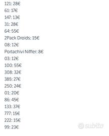 Vendo in blocco 19 personaggi € 170. Vendo separatamente vedere prezzi tabella. Vendo a lotti prezzo da concordare. Nuovi, mai tolti da confezione originale. Spedizione a carico acquirente, spese in base alle dimensioni pacco tramite poste italiane.