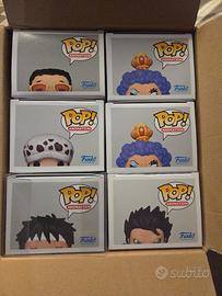 vendo funko pop one piece in perfette condizioni a parte la barca di barbabianca con scatola danneggiata. X3 Sanji bronze 45 X3Chopper bronze 45 X2 Nami bronze pre release 50 X2 Usopp bronze pre release 50 Franksuke 15 Teach 20 X3 ivankov 15 Witebird with moby dick 25 (scatola danneggiata) Luffy & foxy 15 Onami 10 Choppermon 10 Orobin 10 Nami 10 Buggy 15 Luffy gr5 15 Borsalino 15 Luffy snakeman 10 Luffy messico comix 75 Law glow 1894 20