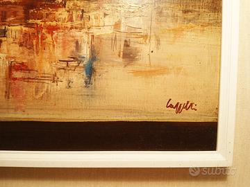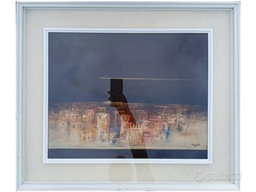 Quadro di denuncia sociale proveniente da galleria, dipinto olio su tela nel 1975 e firmato fronte e retro dal pittore Giovanni Cappelli (1923-1994), appartenente alla cosiddetta Scuola Cesenate insieme ad Alberto Sughi e Luciano Caldari. Sotto un cielo nero percorso dalla scia di una stella cadente compaiono gli edifici di una città, chiari sullo sfondo scuro. Il tema di questo lavoro è vicino alla poetica del Realismo Esistenziale, con il paesaggio urbano che diventa luogo desolante in cui gli uomini conducono le loro vite in solitudine. La stesura del colore è piana e omogenea nella parte superiore, ricca di paste in rilievo a delineare le case in quella inferiore. Misura tela 50x40. Il quadro si trova a Brescia, per la consegna è possibile trovarsi a metà strada.