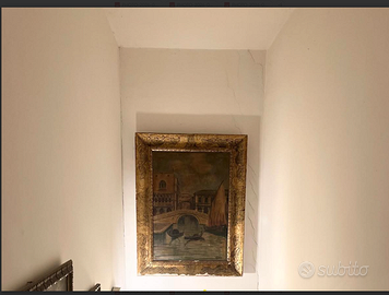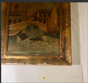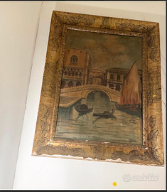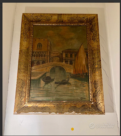 MAESTOSO e ESCLUSIVO dipinto a olio firmato dall'artista G. PATRIZIO raffigurante una tipica veduta Veneziana "Ponte dei SOSPIRI", racchiuso in preziosa cornice dorata d'epoca, finemente intagliata. Antico riconducibile alla fine del XIX° secolo. CONDIZIONI: ottimo stato conservativo ma essendo un articolo antico/vintage può presentare i lievi segni del tempo che ne attestano l'originalità e il fascino. Proveniente da collezione privata Villa Veneta del '900. MISURE: L75xh85cm c.a. VISIBILE e RITIRABILE zona Treviso CARATTERISTICHE: Questo dipinto rappresenta una classica veduta veneziana, risalente alla metà fine del XIX° secolo, quando le scene di Venezia erano estremamente popolari come souvenir artistici e decorazioni domestiche. La tecnica pittorica e la cornice dorata con decorazioni elaborate riflettono lo stile decorativo tipico del periodo.
