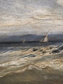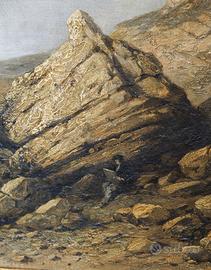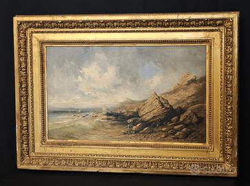 Dipinto ad olio su tela del pittore francese Gabriel-Hippolyte Lebas (1812-1880) La composizione tipica dell’artista mostra un paesaggio costiero con alte scogliere rocciose e mare mosso, con mare e imbarcazioni collocate sullo sfondo sotto un cielo carico di nubi, creando una scena di forte atmosfera romantica. Tra le rocce è visibile una piccola figura, intenta a dipingere il paesaggio. Il dipinto è presentato in un‘importante cornice dorata coeva ✍️ Firmato e datato Hip Lebas. 1876 trouville 📏 Dimensioni • Senza cornice: 64 × 39 cm • Con cornice: 88 × 62 cm ✔️ Buone condizioni generali, la tela non presenta rotture o strappi, pittura in buono stato generale ( vedi foto). Cornice coeva in buono stato generale. 🧑🎨 Gabriel-Hippolyte Lebas (1812–1880) fu un pittore paesaggista francese, figlio dell’architetto neoclassico Louis-Hippolyte Lebas, autore della chiesa parigina di Notre-Dame-de-Lorette e della prigione della Petite Roquette. Formatosi con François-Marius Granet, espose al Salon di Parigi dal 1836 e si specializzò in paesaggi naturalisti e vedute costiere, spesso ambientate in Normandia, caratterizzate da rocce in primo piano e cieli tempestosi. Le sue opere sono state battute all’asta da importanti case d’asta internazionali come Tajan, Dorotheum e Christie’s, con risultati compresi tra alcune centinaia e alcune migliaia di euro. ✅ Per ulteriori informazioni non esitate a contattarmi Mercatino dell'antiquariato Tiriciclo , Salerno
