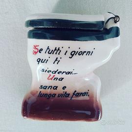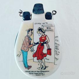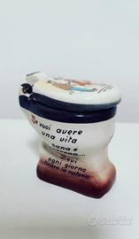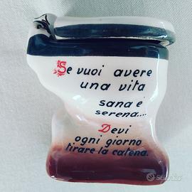 Raro portacenere in ceramica a forma di WC, acquistato come gadget negli anni ’60, si veda il richiamo alla canzone di Modugno vincitrice del Festival di Sanremo 1958. Oggetto decorativo, raffigura un piccolo water con messaggi umoristici. Realizzato in porcellana bianca con decori, misura altezza 9 cm, profondità 8 cm, larghezza 6 cm.