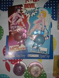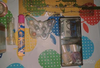 Profumo Fiorucci (vuoto) gli altri articoli sono datati ma in buone condizioni, solo uno dei trucchi ha il cappuccio di plastica rotto ma all'interno tutto come nuovo. 3 riviste cioè tenute benissimo.