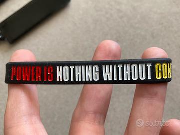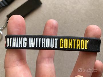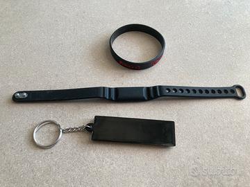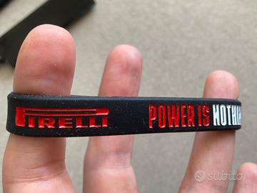 Set di 3 gadget in gomma nera con scritte gialle, bianche e rosse, composto da 1 braccialetto con la scritta incisa e colorata “Pirelli POWER IS NOTHING WITHOUT CONTROL”, uno elettronico con perni metallici per chiudere l cinturino ed infine un portachiavi con gancio metallico ed il logo in rilievo.