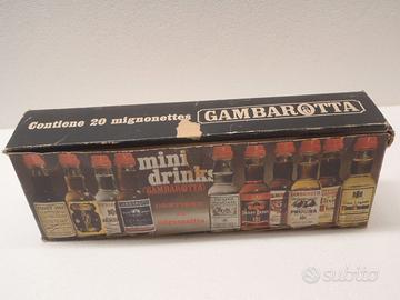 Confezione 20 (18) mignonettes Mini Drinks, da collezione, della GAMBAROTTA (poi Inga), distilleria di Serravalle Scrivia (AL). Trattasi di una coppia di bottigliette di liquore da circa cl 2,5; in particolare: