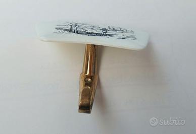 Bellissimo gancio appendiabiti o attaccapanni vintage in bachelite e ottone con splendida immagine della vita quotidiana in campagna.