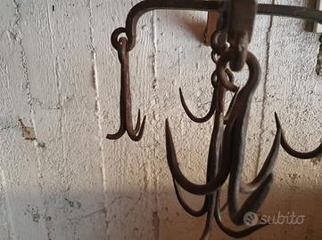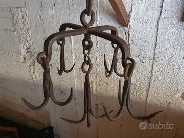Antico attrezzo gancio a 4 uncini più 1 centrale per pozzo in ferro battuto del XVII° secolo.