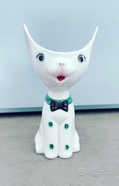 Gattino in ceramica smaltata dipinta a mano, caratteristico collare con fiocco verde. Produzione Italiana degli anni ’40, attribuito a Tarcisio Tosin noto per le sue creazioni di gatti in ceramica. Altezza 15,5 cm, base diametro 6,5 cm. Magnificamente conservato nel tempo.