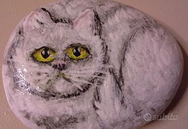 Gatto dipinto su sasso di mare. Misura 6,5 cm per 5,5 cm circa. Dipinto a mano su pietra levigata e arrotondata dal mare. Fermacarte o soprammobile o semplicemente un oggetto da compagnia o collezione. Ho raccolto questa pietra grigia scegliendola questa estate con cura sulla spiaggia, ben levigata dal mare, mi sono immaginata cosa potesse essere e dopo ho trasferito la mia idea su di essa. Ed ecco apparire un timido gattino bianco. Naturalmente la parte posteriore di appoggio l'ho lasciata al naturale a dimostrare la sua origine e lì c’è la mia firma. Se ti piace è tuo.