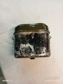 gavetta tedesca ww2 modello in alluminio di fine guerra, priva di marchi sia sul corpo che sul coperchio, mancante di alcune parti, il coperchio probabilmente è stato aggiunto in seguito. Possibilità di spedizione. Disponibile per altre foto o informazioni.