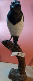 La gazza è stata modellata utilizzando argilla e cartapesta e presenta dimensioni di 41 x 15 x 44 centimetri. È stata accuratamente dipinta utilizzando colori acrilici che replicano fedelmente i toni naturali della gazza. Gli occhi sono stati realizzati in vetro, con colori che replicano quelli dell'iride originale nera dell'animale. Questa creazione rappresenta un pezzo unico e originale, un'opera d'arte che cattura la bellezza e la realtà della natura.