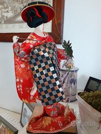 Figurina/bambola Geisha realizzata in stoffa su anima di ferro e su base di legno. Prodotto artigianale giapponese realizzato alla fine degli anni "60, rappresenta una geisha con kimono da matrimonio rosso in pregiato tessuto tramato in seta, copricapo recante il pallino azzurro delle feste, porta in entrambe le mani rametti di foglie di tè quale auspicio di salute. L'articolo è, data la sua età, in condizioni estetiche molto buone se non per piccole macchioline di umido presenti sulla base in legno e sul collo del kimono.