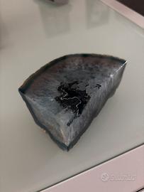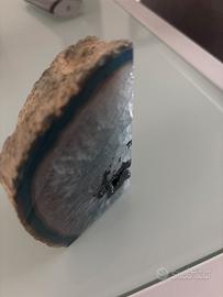 L'oggetto nell'immagine è una sezione di geode d'agata. Le geodi d'agata sono strutture geologiche che si formano in rocce vulcaniche e sedimentarie, riempiendo cavità con strati di minerali di silice, come il calcedonio e i cristalli di quarzo.
