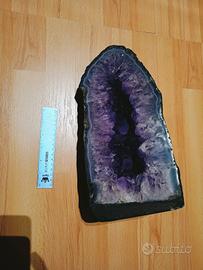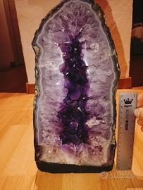Questo straordinario geode di ametista è un pezzo da collezione unico, perfetto per esposizione o come investimento in cristalli di qualità. Dimensioni: 31 × 15 × 14 cm Peso: 7,3 kg Cristalli: ametista vivida, dal viola chiaro al centro quasi nero, cristalli centimetrici ben formati e brillanti Condizioni: perfette, nessuna frattura, crepa o danno; completamente naturale, senza trattamenti Provenienza: Ametista do Sul, Brasile Caratteristiche speciali: aspetto scenografico, ideale da esposizione, ufficio o collezione 💎 Questo geode è un pezzo spettacolare, pronto da ammirare: il colore intenso e uniforme dei cristalli e la perfezione naturale lo rendono raro e ricercato. Prezzo richiesto: €800 – un’occasione per aggiudicarsi un geode di alta qualità, pronto da collezione.