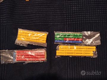 la scatola da 90 pezzi è composta soltanto da pannelli cioè parti di plastica senza bilie e senza bastoncini ed è completa. La scatola da 64 pezzi e completa a parte un bastoncino che manca e quindi ci sono 29 bastoncini su 30 di dimensioni lunghe. la terza scatola è formata soprattutto da pannelli di plastica senza bastoncini. A parte, compresi nel Lotto i 52 bastoncini di dimensioni standard e di colori diversi.