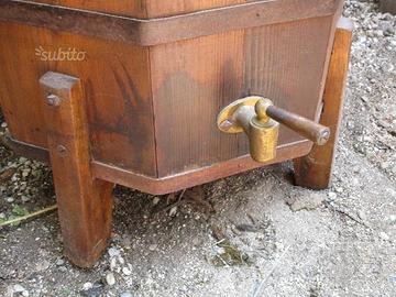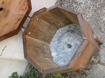 Antica ghiacciaia per birra a caduta, di forma ottagonale, tutta in legno massello con il fondo interno rivestito in lamiera zingata, misura cm 54 x 54 x altezza cm 68. Risale agli inizi del '900.