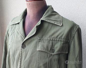 N229) Giacca vintage da caccia in tela color verde-kaki. Ha la particolarità di avere uno scomparto posteriore per essere usato come zainetto incorporato nella giacca e un rinforzo sulla spalla destra per appoggio della cinghia di trasporto dell'arma. Taglia riportata 50 senza impegno su taglie, vestibilità ecc. Queste sono le principali misure orientative e non impegnative: spalle cm. 48 - manica cm. 57 - petto cm. 51 - lunghezza totale da colletto parte superiore a fondoschiena cm. 73. Non sono presenti marchi o etichette. Poco usata in buone condizioni generali. Presenta qualche alone nella parte posteriore inferiore e sempre nella stessa zona un piccolissimo buco.