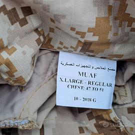 Autentica giacca da deserto pixel mimetica digitale MARPAT della Guardia Nazionale dell'Arabia Saudita simile ai M65 dell'esercito americano. In ottime condizioni, nuova. nessuna macchia o segno di rottura. Completo di fodera interna, anch'essa nuova. Taglia X Large (taglie dell'esercito americano). Oggetto come da foto